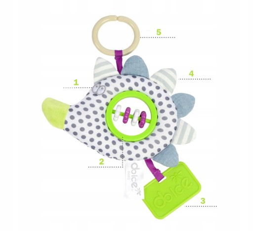 Nazwa marki Dolce - wzięła się od słów develop (rozwijać się), observe (obserwować), learn (uczyć się), crate (tworzyć), educate (kształcić). Każda zabawka Dolce Toys wykonana jest różnych tkanin, posiada atrakcyjną i różnorodną kolorystykę, a także posiada szereg funkcji, które pobudzają wszystkie zmysły dziecka oraz zachęcają do zabawy.
