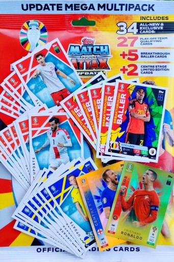 TOPPS z dumą prezentuje pierwszą w historii kolekcję Match Attax na EURO 2024 – pełną ekscytujących podzbiorów i unikalnych kart, w tej niesamowitej nowej, pełnej akcji kolekcji znajdują się wszystkie kwalifikujące się drużyny. Do zebrania jest 457 kart w różnych kategoriach, w tym : Golden Goalscorer, Centurion, Hero, Ultimate, Graduated Gem, Legends, 100 Club plus i wiele innych. Zwróć uwagę na parallels Crystal, Emerald oraz Sapphire , EURO Energy , EURO Black Edge cards, EURO Auto i Combo , EURO Chrome Shields oraz niezwykle rzadką kartę Career Celebration CRISTIANO RONALDO.