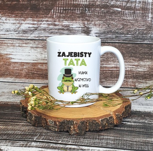 Na koszulce i na kubku nadrukowany jest tekst "Żajebisty tata kuma wszystko w mig". Tekst nadruku jest stały i nie podlega modyfikacjom.