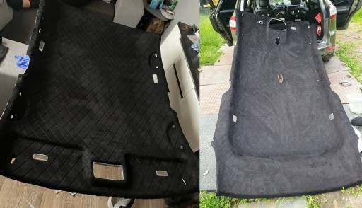 Materiał posiada krótki włosek, który po przeciągnięciu ręką zmienia kierunek swojego położenia, identycznie jak w oryginale, rozciągliwy, idealnie kształtuje się na podsufitce, gąbka nie wchłania kleju.