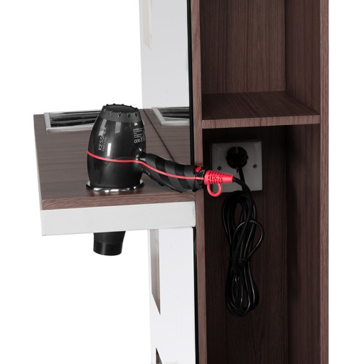 Nowoczesna konsola fryzjerska z dużym lustrem i podręcznymi półeczkami z obu stron. Zawartość półek z jednej strony są widoczne przez "okienka" Wykończenie najwyższej klasy. Elegancki i jednoczesnie uniwersalny element wnetrza, który podkresli charakter każdego salonu.