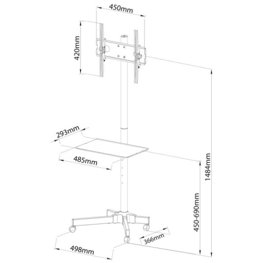 Oferuje regulację wysokości, solidną konstrukcję oraz półkę na sprzęt Audio Video. Zgodny ze standardem VESA od 75×75 mm do 400×400 mm ,zapewniający estetyczne zarządzanie kablami i mobilność dzięki czterem blokowanym kółkom."