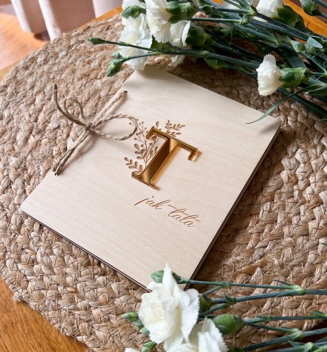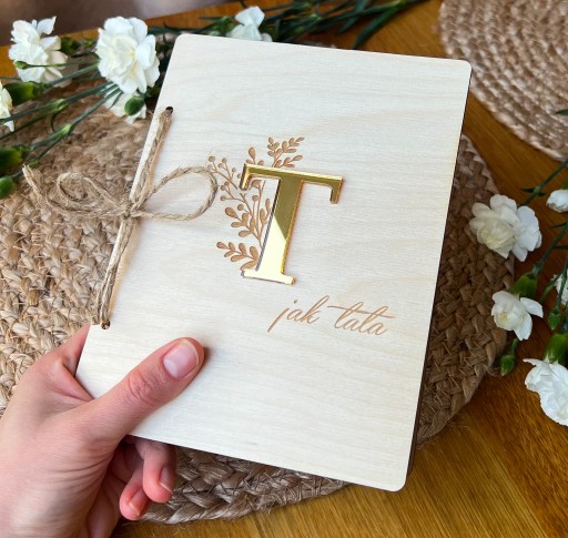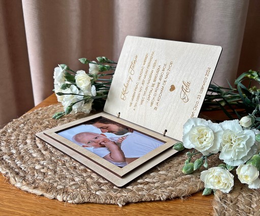 Przepiękna pamiątka z okazji pierwszego dnia taty. Drewniana otwierana kartka z ramką na zdjęcie i życzeniami dla taty.