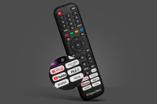 Dołączony do telewizora Kruger&Matz pilot został zaprojektowany z myślą o wygodnym i intuicyjnym użytkowaniu. Na pilocie znajdują się skróty do najpopularniejszych aplikacji, takich jak Netflix, YouTube czy Amazon Prime Video. Dzięki nim możesz szybko uruchomić ulubione treści bez konieczności przeglądania menu czy wyszukiwania aplikacji.
