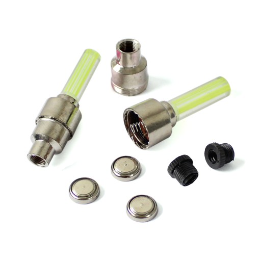 Wentyl posiada czujnik ruchu, a więc świeci tylko podczas jazdy. Dodatkowo w zestawie przejściówka na wentyl samochodowy oraz 3 sztuki baterii LR1130.