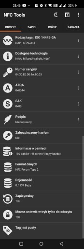 W ten sposób (wybór w aplikacji zakłądki "Zapisz") - możemy zapisywać dane na tagu, np: