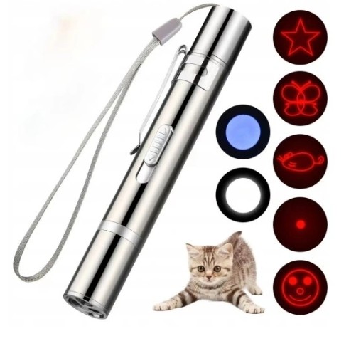 3 tryby i 5 wymiennych zabawek dla kotów: 3 tryby (czerwone światło ultrafiolet białe światło) 5 trybów czerwonego światła (kropka motyl uśmiechnięta twarz gwiazda mysz)