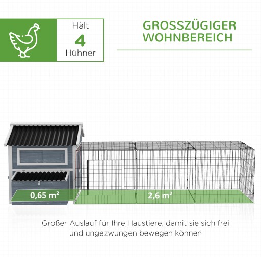 Zapewnij swoim kurkom dużo miejsca i komfortu dzięki naszemu kurnikowi PawHut. Z przestronnym wybiegiem i budą zapewnia on twoim pióropuszowym przyjaciołom dużo miejsca do relaksu. Ukryte gniazda zapewniają lepsze składanie jaj. Dzięki użyciu ekologicznych materiałów w budowie kurnika, możesz zapewnić swoim zwierzętom zdrowy i bezpieczny dom, jednocześnie chroniąc naszą planetę.