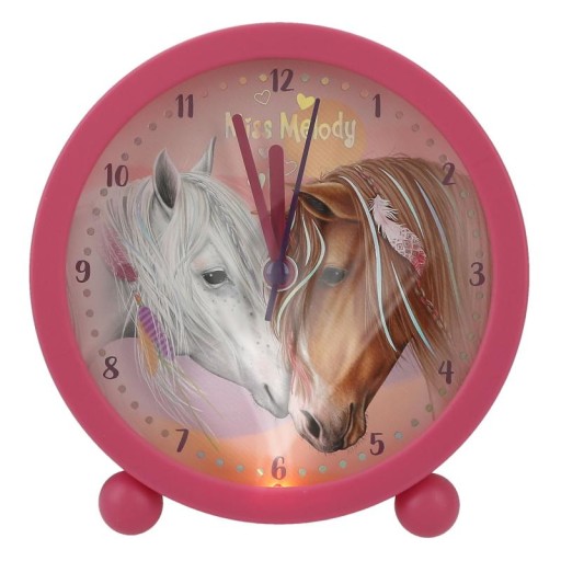 Ładny budzik w różowej obudowie ma fantastycznie piękną tarczę z dwoma końmi na różowym tle.