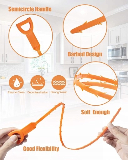 WYSOKA JAKOŚĆ I DOBRA ELASTYCZNOŚĆ: narzędzia do usuwania włosów są wykonane z trwalszego polipropylenu wysokiej jakości, narzędzia do usuwania włosów są trwalsze i nie są łatwe do złamania lub złamania.Dobra elastyczność może zginać się w wielu rodzajach sit i rur Ulepszona konstrukcja z zadziorami może łatwo chwytać i usuwać zbite włosy w odpływie.