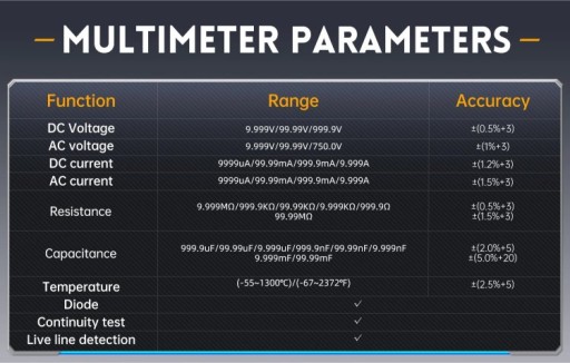 - Zaawansowane możliwości multimetru: Oferuje 4-cyfrową 10000-punktową rzeczywistą wartość efektywną, mierzącą napięcie i prąd AC/DC, pojemność, rezystancję, diodę oraz funkcje włączania/wyłączania.