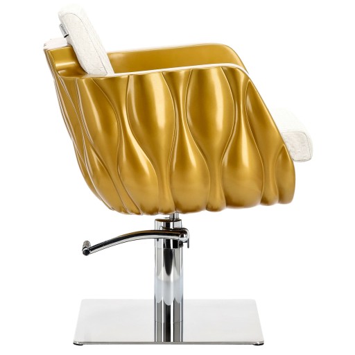 Fotel charakteryzuje się eleganckim i ergonomicznym designem, który pozwala na wygodną pracę fryzjera oraz relaks klientów.