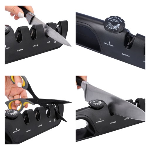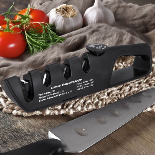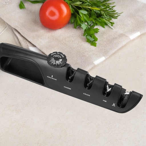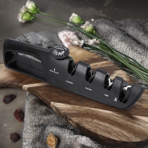 Ostrzałka wyposażona jest w trzy stopnie ostrzenia, pozwalające na dostosowanie ostrza do potrzeb różnych typów noży - od tych do filetowania, przez standardowe, aż po myśliwskie. Dodatkowo posiada możliwość ostrzenia nożyczek.