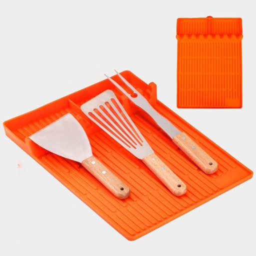 [Idealny wybór prezentu] Doskonale do trzymania widełek, pędzli, łyżek, szczotek, szpul, tongów, widełek i butelki z przyprawami do BBQ, ta podkładka do pędzli z silikonu jest praktycznym rozwiązaniem dla każdej kuchni lub blatu roboczego. Powitanie z powodu wystąpienia błędów roboczych brudnymi pędzlami! To wybór prezentu dla dostępnego BBQ i idealnego do stołków bocznych Blackstone.