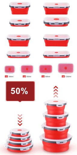 PRZENOŚNE SILIKONOWE POJEMNIKI NA LUNCH ŻYWNOŚĆ SKŁADANE MISKI NA POSIŁKI W KUCHENCE MIKROFALOWEJ ZESTAW 8 SZT (350ML/500ML/800ML/1200ML - CZERWONY)