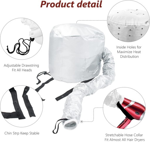 Ten kaptur suszarki może być używany do farbowania włosów, stylizacji za pomocą wałków, głębokiego odżywiania, gorących olejków i zabiegów termicznych. Jest to idealne akcesorium do odżywek, olejków rycynowych, lokówek i wałków!