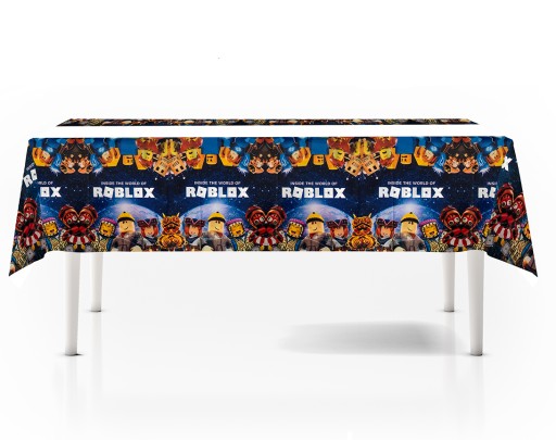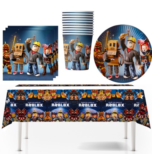 Zestaw zawiera: 10 szt. talerzyków, 10 szt. kubków, 20 szt. serwetek i 1 szt. obrus z motywem Roblox.
