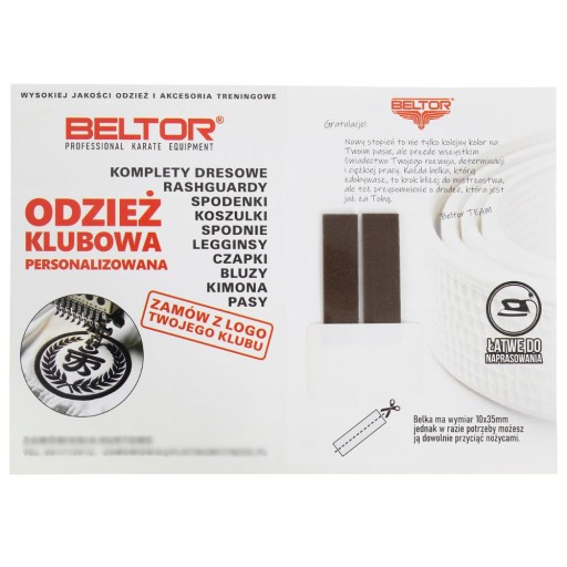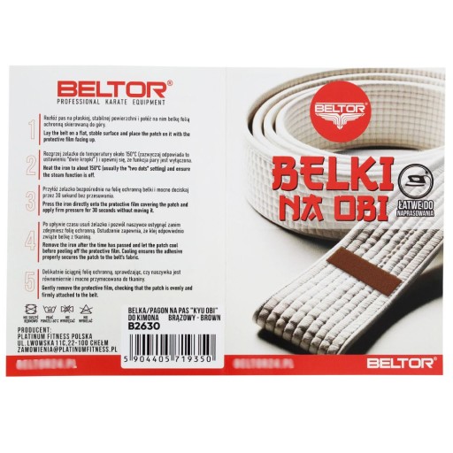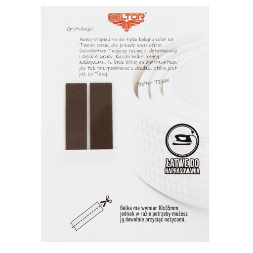 Belki na Obi Beltor to gotowe rozwiązanie na szybkie zamocowanie belki na pasie do kimono! Opakowanie zawiera 2 belki, do naprasowania z przodu i tyłu pasa lub obok siebie. Materiał belki jest bardzo przyjemny w dotyku i przypomina zamsz. Po naprasowaniu jest lekko wypukła i ma piękny żywy kolor. Po aplikacji belka jest trwale związana z materiałem. Można prać w pralce - w temperaturze poniżej 60'C.