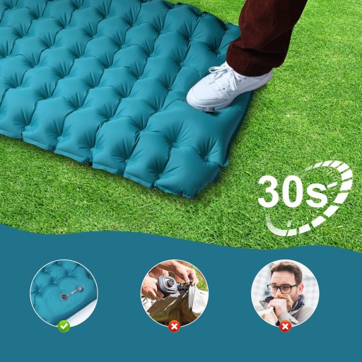 🕘🕘🕘【Tylko 30 s nadmuchania i spuszczanie powietrza w 3 sekundach】 Dzięki ulepszonej pompie szybko nadmuchiwanej nasza podkładka kempingowa może być napompowana naciskiem stóp lub dłoni. Koniec z nadmuchiwaniem przez usta, noś ciężką pompkę i wystarczy, że nadmuchasz ją na wbudowaną pompkę powietrza na spodzie podkładki do spania przez zaledwie 30 sekund, aby napompować lub otworzyć nadmuchiwany korek na poduszce, który potrzebuje tylko 3 sekund, aby osiągnąć bardzo szybką deflację.