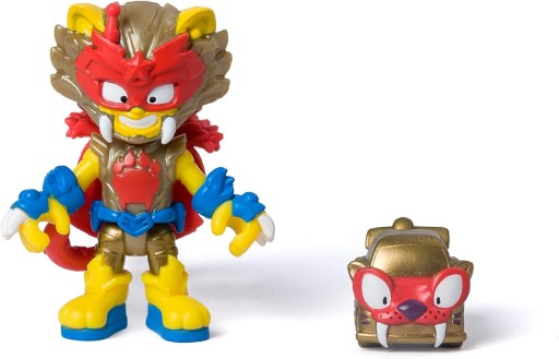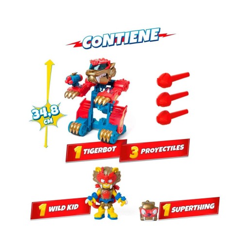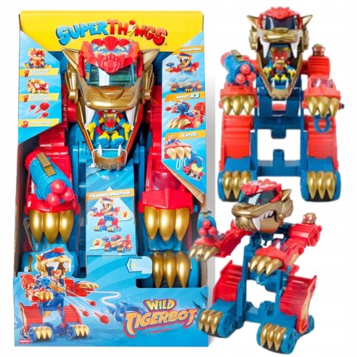 To szybki bolid… A teraz to gigantyczny robot! To największa bestia w Kaboom City, której siła jest również gigantyczna! To SuperThings Wild Tigerbot!Wystarczy jeden gest, by przeszedł transformację – naciśnij jego ogon, a przejdzie z trybu RACE (pościg) do trybu ATTACK (atak). Za pomocą swoich pazurów może wystrzelić szczypce, by schwytać SuperThingsy i za pomocą przycisku ściągnąć je do siebie. Dodatkowo jeden z pazurów ma specjalną armatkę z aż trzema pociskami!W zestawie znajdują się ekskluzywne postacie: Wild Kid i Wild Superthing. Mogą sterować robotem z kokpitu znajdującego się wewnątrz paszczy tygrysa. Co za emocje!Zawartość: