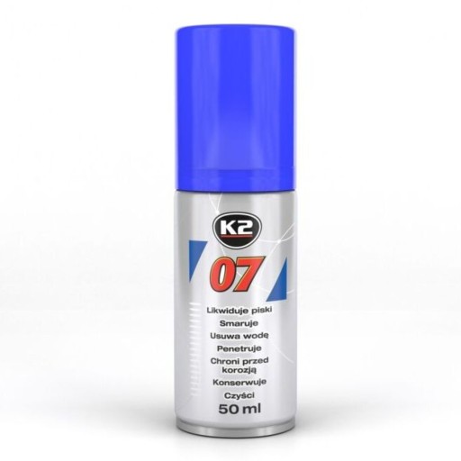 Czyści i chroni przed korozją metalowe (chromowane, aluminiowe, stalowe) elementy w samochodzie np. anteny radiowe, felgi, zawiasy itp. Preparat wielofunkcyjny K2 07 eliminuje piski i zgrzyty elementów metalowych, plastikowych, gumowych i mechanicznych np. pasków klinowych, elementów łożyskowanych. Chroni uszczelki w szyber dachu, drzwiach, bagażniku oraz wycieraczki. Usuwa wilgoć oraz zabezpiecza przewody zapłonowe i styki elektryczne. Chroni powierzchnie wykonane z plastiku, winylu. Poluzowuje i pomaga odkręcić zardzewiałe śruby. Smaruje lusterka, przyciski deski rozdzielczej, zawiasy schowka i drzwi, siłowniki bagażnika, korbki szyb, wysuwane anteny, zamki.