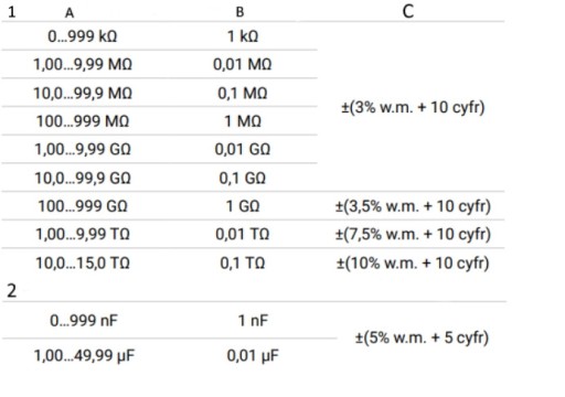 - Napięcia pomiarowe wybierane w zakresie 50…5000 V, 50…1000 V co 10 V, 1…5 kV co 25 V