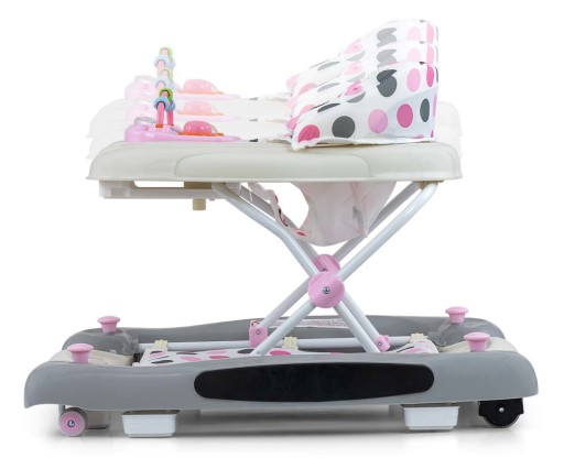 Produkt posiada edukacyjny panel, który zawiera szereg niespodzianek czekających na małych odkrywców: światełka, piszczałki, melodyjki, grzechotka, przyciski i inne ruchome elementy. Po wypięciu panelu z tacki chodzika posłuży on jako niezależna zabawka, np. jako umilacz w podróży a blat przyda się jako stolik do zabaw.
