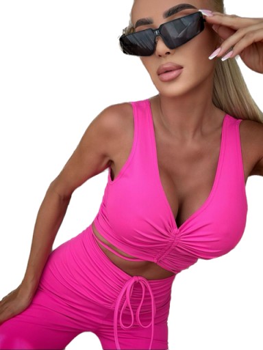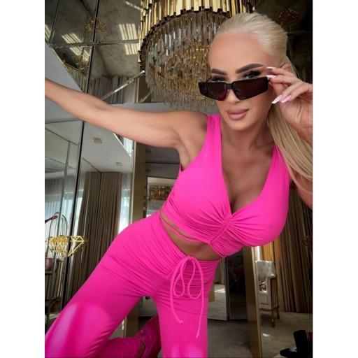 Top o dopasowanym kroju wykonany jest z matowej bardzo elastycznej lycry w pięknym odcieniu fuksji. Model na ramiączka z dekoltem w kształcie litery V. Pośrodku bluzki znajduje się efektowne cięcie z tunelem i sznureczkiem, co daje nam możliwość regulacji długości bluzki, jak i tworzenia marszczeń. Dzięki możliwości wydłużenia bluzki możemy razem z legginsami stworzyć połączony komplet, co wygląda jak kombinezon.