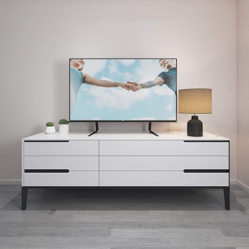 📺 NISKI PROFIL I OSZCZĘDZAJĄCA PRZESTRZEŃ KONSTRUKCJA: Przestrzeń między dwiema nogami zapewnia idealne umieszczenie sprzętu audio lub akcesoriów; solidna konstrukcja stalowa z systemem dwunożnym zapewnia dużą stabilność i trwałość; dolne podkładki zapobiegają zarysowaniu powierzchni