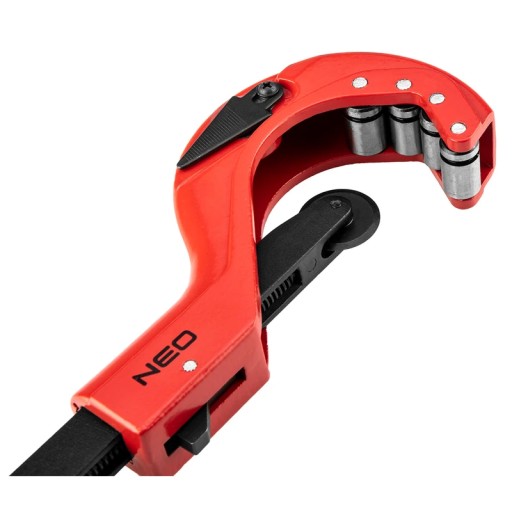 Obcinak do rur z tworzyw PVC, PE, PP, 6 - 63 mm (1/4" - 2.3, 8"), cztery rolki prowadzące, korpus aluminiowy, śruba nastawna, mechanizm szybkonastawny