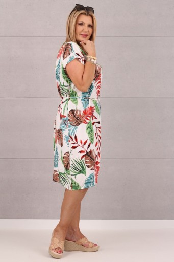 Ta sukienka to lekka i ciekawa kreacja, idealna na sezon letni. Swobodny fason oversize zapewnia komfort i swobodę ruchów, co sprawia, że jest doskonałym wyborem na ciepłe dni. Wzór liści nadaje jej niepowtarzalnego uroku i świeżości, co podkreśla letni charakter sukienki. Dodatkowo, sukienka jest wyposażona w sznureczek, który efektownie podkreśli talię, nadając sylwetce zgrabniejszy wygląd. Ten model świetnie sprawdzi się na różnorodne okazje – od wyjazdów, przez spacery po plaży, jak również na kolacje podczas cieplejszych wieczorów. Sukienka łączy w sobie wygodę z modnym wyglądem, co czyni ją niezbędnikiem każdej kobiecej garderoby.