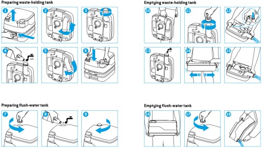 - Ta przenośna toaleta składa się dwóch odłączanych części: zbiornika na nieczystości oraz zbiornika na wodę do spłukiwania