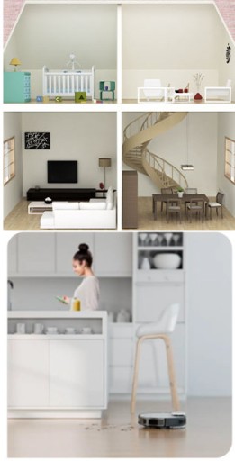 Ten robot sprzątający zna Twój dom prawie tak dobrze jak Ty! Nawigacja laserowa sprawia, że mapy przestrzeni życiowej są dostępne w każdej chwili za pośrednictwem inteligentnej aplikacji na urządzenia mobilne z systemem iOS i Android. Możesz więc zamówić czyszczenie na przykład w kuchni lub przy stole w jadalni. Można także łączyć pokoje w obszary sprzątania i tworzyć indywidualne ustawienia sprzątania.