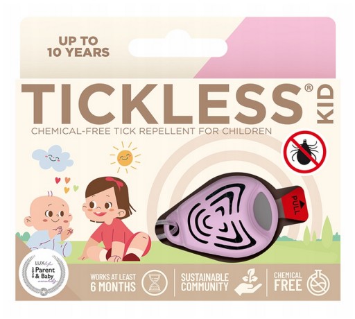TICKLESS® Kid to sposób na kleszcze bez szkodliwej chemii. Urządzenie polecane szczególnie dzieciom, ponieważ nie trzeba pamiętać o włączaniu: działa od momentu wyjęcia zawleczki do rozładowania baterii (co najmniej 6 miesięcy).