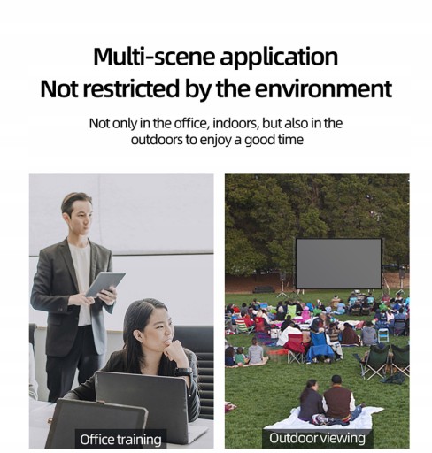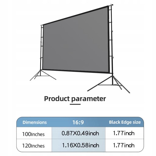 Dostępnych jest wiele rozmiarów 84 cali, 100 cali i 120 cali do wyboru dla ekranu z podwójnym trójkątnym wspornikiem przeciwoświetleniowym