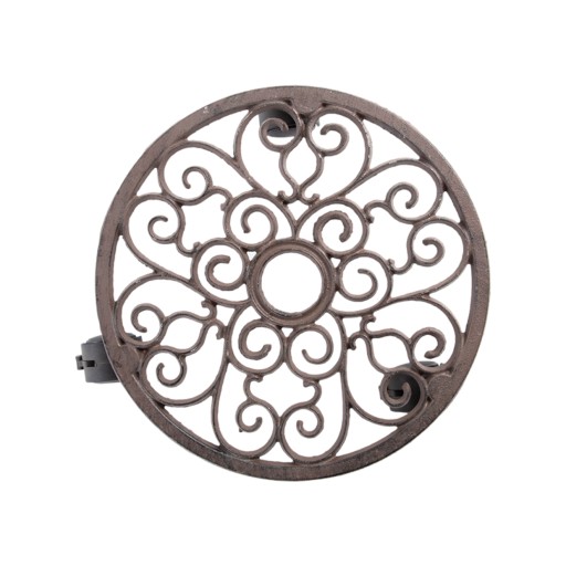 Okrągły żeliwny wózek do roślin w kolorze rdzawo-brązowym z plastikowymi kółkami.