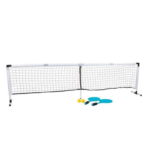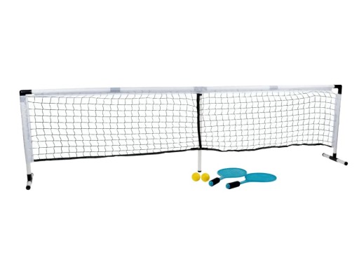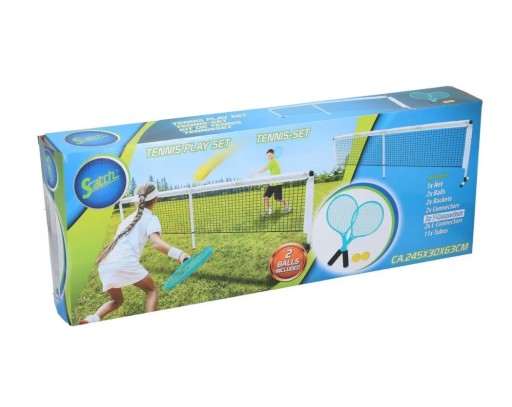 Od teraz możesz zagrać w tenisa w swoim ogrodzie, kiedy tylko chcesz. Z zestawem firmy Scatch jest to bardzo proste. Wystarczy rozstawić siatkę, wziąć rakietki oraz piłki i zagrać. Siatka jest łatwa w montażu dzięki poręcznej konstrukcji i stabilnie trzyma się na specjalnych poprzecznych stopkach. Można ją również błyskawicznie zdemontować, co sprawia, że można ją zabrać wszędzie ze sobą, na przykład na kemping czy wakacyjny wyjazd. Rakiety wykonane są z wytrzymałego tworzywa sztucznego i wytrzymują mocniejsze uderzenia. Dzięki piankowym piłeczkom można ćwiczyć forehand, backhand, serwis i podania. Zestaw do tenisa składa się z 1 siatki do tenisa, 2 rakietek, 2 piłek, 2 łączników T, 2 łączników L i 11 rurek. Siatka ma 245 cm długości i 63 cm wysokości.
