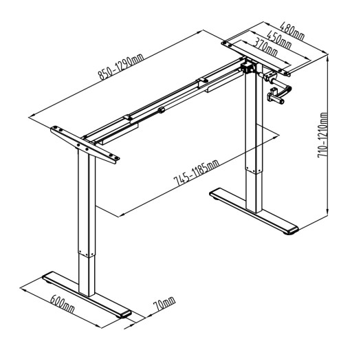 Wszechstronna rama elektrycznego stelaża oprócz regulacji góra/dół pozwala na ręczną regulację horyzontalną (w bok). W łatwy sposób rozszerzysz konstrukcję pod wymiar swojego blatu. Sugerowane wymiary blatu: 1000-1600 mm (szerokość), 600-800 mm (głębokość).