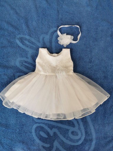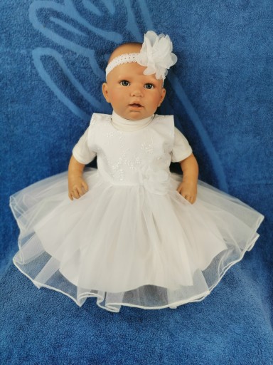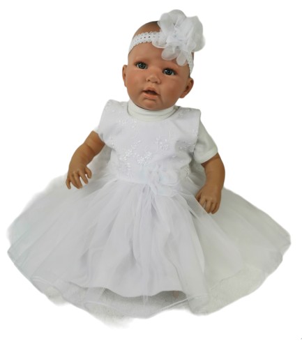 Sukienka w kolorze białym , wykonana z eleganckiej delikatnej tkaniny, zapinana z tyłu na suwak. W pasie duży tiulowy kwiat. Taki sam znajduje się w opasce. Dół pokryty tiulem. Góra pokryta delikatną koronką.
