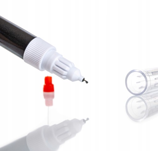 Zestaw posiada bezpieczny pojemniczek na ciecz i malutki, giętki pędzelek zaprawkowy. Zestaw umożliwia dokonanie małych korekt. Dodatkowo w górnej części igła do precyzyjnego działania.