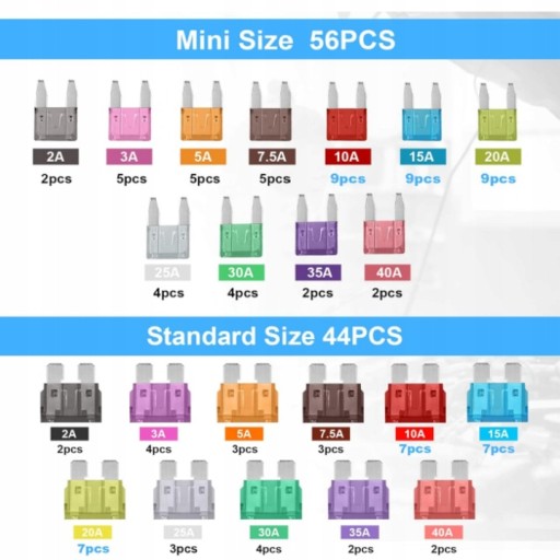 Zestaw zawiera 56 sztuk rozmiaru mini i 44 sztuk rozmiaru standardowego. Dwa rodzaje bezpieczników mają 11 specyfikacji prądu (2A /3A / 5A/ 7,5A/ 10A/ 15A/ 20A/ 25A / 30A/ 35A/40A), wyposażone w chwytak do bezpieczników.