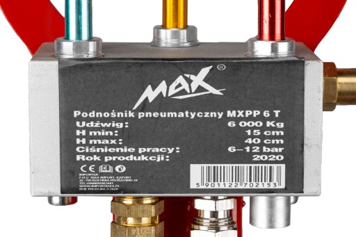 W podnośniku zastosowano 2 zawory - wlotowy i wylotowy. Takie rozwiązanie zapewnia najwyższy komfort pracy oraz możliwość odłączenia źródła powietrza po napompowaniu bez groźby niekontrolowanego opadnięcia podnośnika.