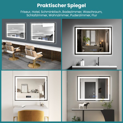 Lustro łazienkowe 80x60, włącznik światła LED, przeciwmgielne, wyświetlacz zegara, 3 regulacja barwy światła, Metalowa czarna rama