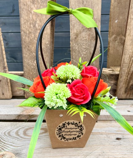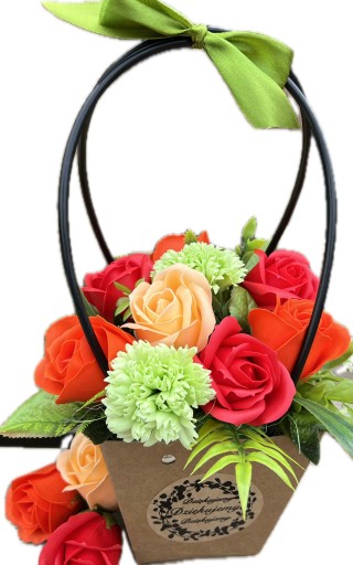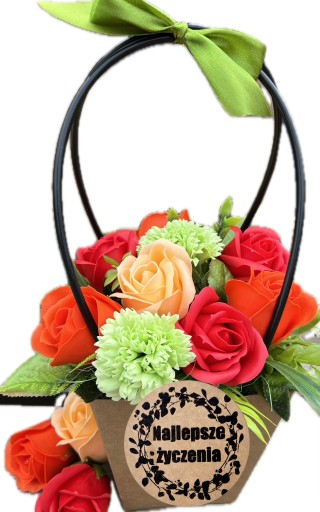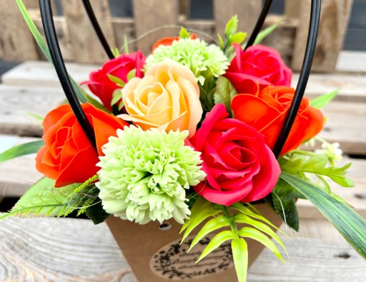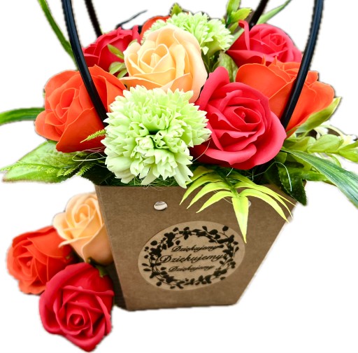 ❤️ piękne pachnące, duże mydlane kwiaty w odcieniach czerwieni i pomarańczy w otoczeniu ozdobnego sizalu i sztucznych dodatków zielonych, całkowita wysokość to 34 cm, średnica to około 20 cm (bez wystających długich liści),