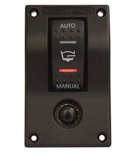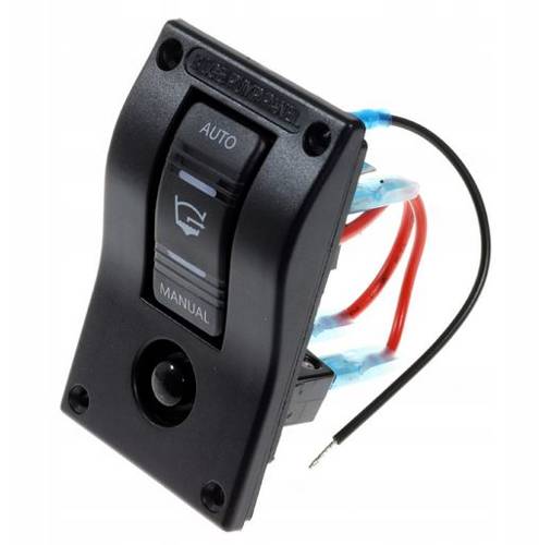 PRZEŁĄCZNIK / WŁĄCZNIK POMPY ZĘZOWEJ - Uniwersalny panel kontrolny dla pomp zęzowych posiadających automatyczny włącznik (pływakowy lub elektroniczny). Umożliwia pracę w trybie ON-OFF-(ON): automatycznym, wyłączonym lub ręcznym (wymuszany powrót do pozycji wyłączony - zabezpieczenie). Posiada podświetlenie LED kolor zielony (tryb automatyczny) i czerwony (tryb ręczny). Na panelu znajduje się gniazdo z automatycznym bezpiecznikiem termobimetalicznym. Wykonany z wysokiej jakości mocnego tworzywa w kolorze czarnym.