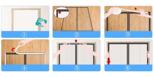 - Oderwij drugą folię ochronną z rzepów oraz z listew mocujących i przyklej całość do ościeżnicy drzwi zaczynając od samej góry (od listew mocujących).