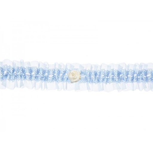 Podwiązka koronkowa w kolorze białym z satynową tasiemką i niebieskim oczkiem, szerokość 3,5 centymetra.