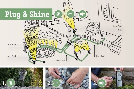 System oświetlenia zewnętrznego Plug & Shine to idealne rozwiązanie oświetleniowe do użytku na zewnątrz, w takich miejscach jak ogrody, tarasy, podjazdy lub inne obszary zewnętrzne.