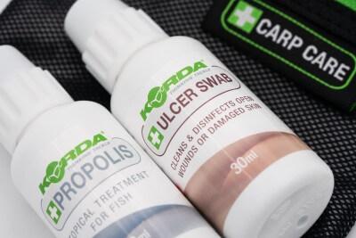Zestaw do pielęgnacji karpi przed ich bezpośrednim wypuszczeniem. Zawiera dwa produkty, które pozwalają utrzymać rybę w dobrej kondycji, gwarantując jej szybkie zagojenie ewentualnie powstałych ran. Ulcer Swab jest antyseptycznym środkiem, który można stosować do zabezpieczania otwartych ran np. po hakach oraz różnego rodzaju otarć, zmian skórnych itp. Zapobiega zakażeniu bakteriami i grzybami, utrzymując się na skórze wypuszczonej ryby przez dłuższy czas. Propolis jest z kolei środkiem na bazie antybiotyków, który pomaga w leczneniu otwartych ran, wrzodów czy uszkodzonych płetw i zerwanych łusek. W zestawie znajduje się w pełni wodoodporny pokrowiec na oba środki, zapinany na zamek.