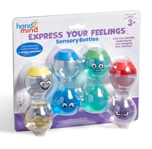 Niezależnie od tego, czy są szczęśliwe, smutne, przestraszone czy wściekłe, proste wyrażenia, kolory i ruch w każdej z 4 hipnotyzujących butelek sensorycznych w tym zestawie pomagają dzieciom identyfikować i wyrażać swoje uczucia i emocje. Każda z butelka ma inny wyraz i jest wypełniona płynnym materiałem, aby stworzyć ruch, który odzwierciedla daną emocje.